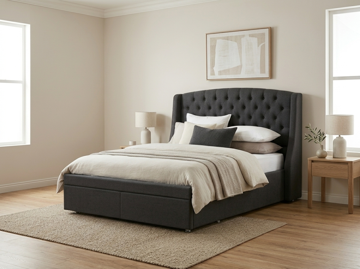 The easiest way to lift a bedroom? Go upholstered. Miramar gives you that instant, hotel style focal point with a classic padded, buttoned headboard and elegant side wings that frame the bed. At the foot, you get two large drawers for bedding and bits — the drawer unit arrives pre assembled on proper runners for a smooth glide and a tidy finish. The full bed still assembles easily at home, and the versatile charcoal fabric plays nicely with light or moody interiors.